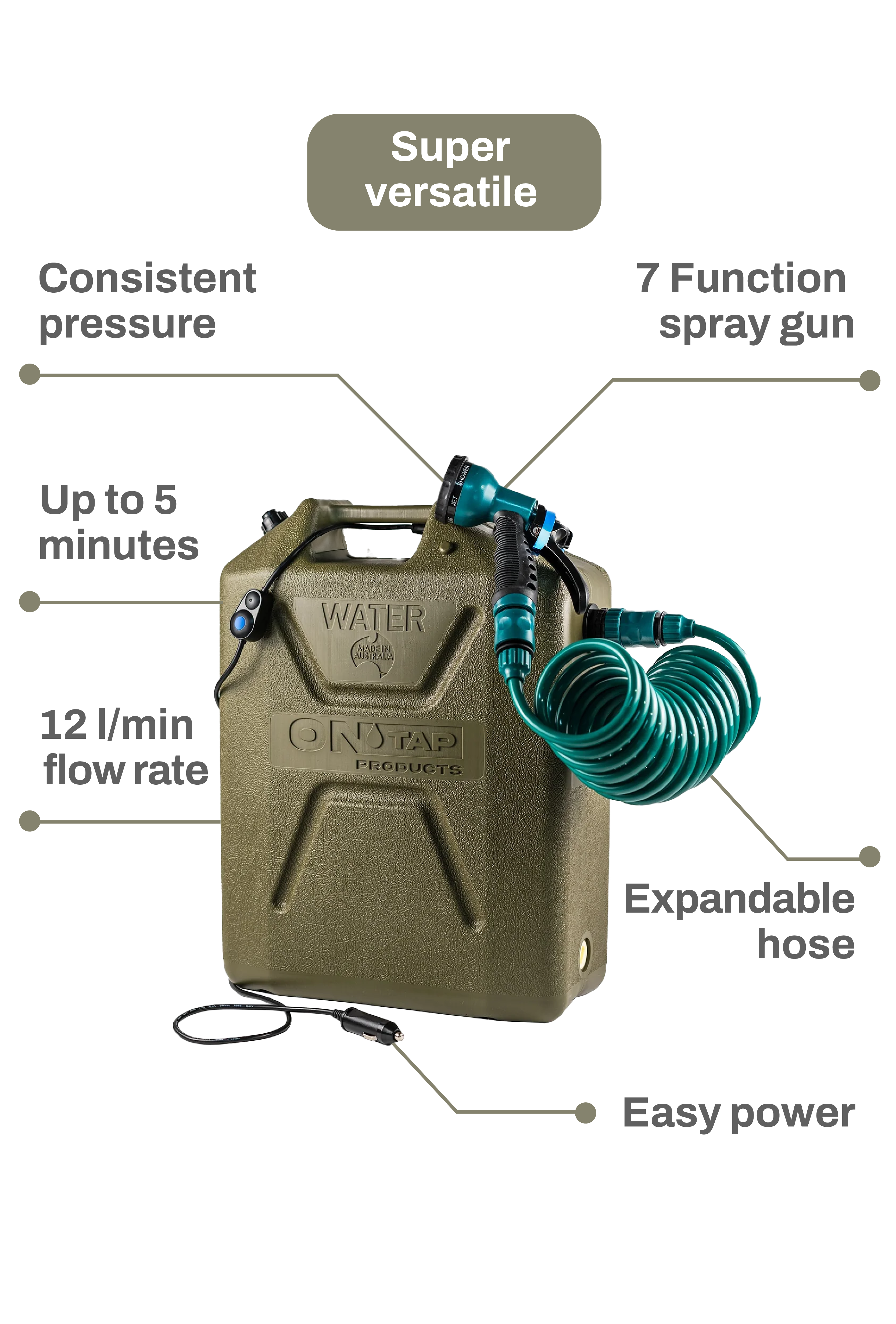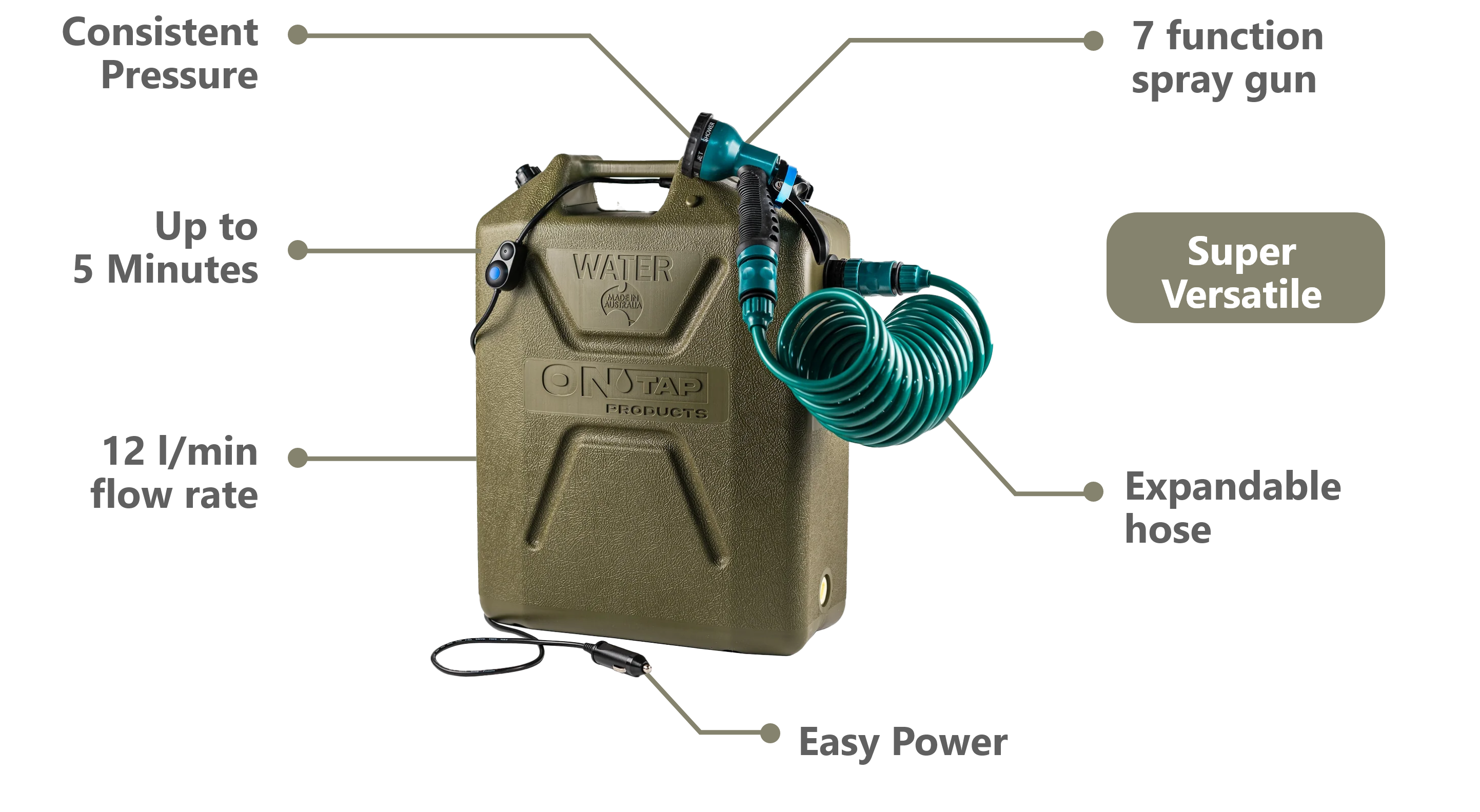 Yes! Simply fill the canister, let it heat up in the sun if you prefer warm water, plug into your car or battery via a 12v plug and flick the switch to activate the pressurised water flow. Perfect for rinsing off after a day of adventure.